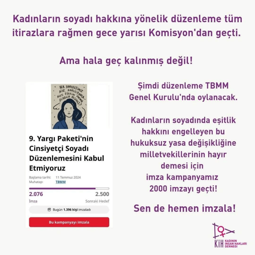Kadınların soyadı hakkına yönelik düzenleme tüm itirazlara rağmen gece yarısı Komisyon’dan geçti. Ama hala geç kalınmış değil! Şimdi düzenleme TBMM Genel Kurulu’nda oylanacak. Kadınların soyadında eşitlik hakkını engelleyen bu hukuksuz yasa değişikliğine Milletvekillerinin hayır demesi için imza kampanyamız 2000 imzayı geçti! Sen de hemen imzala!